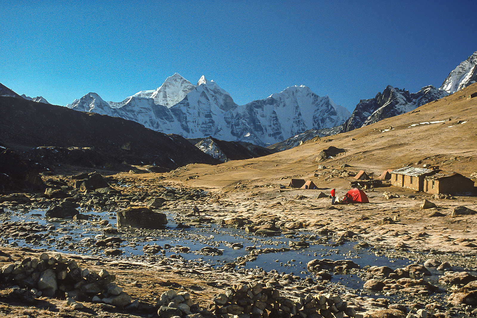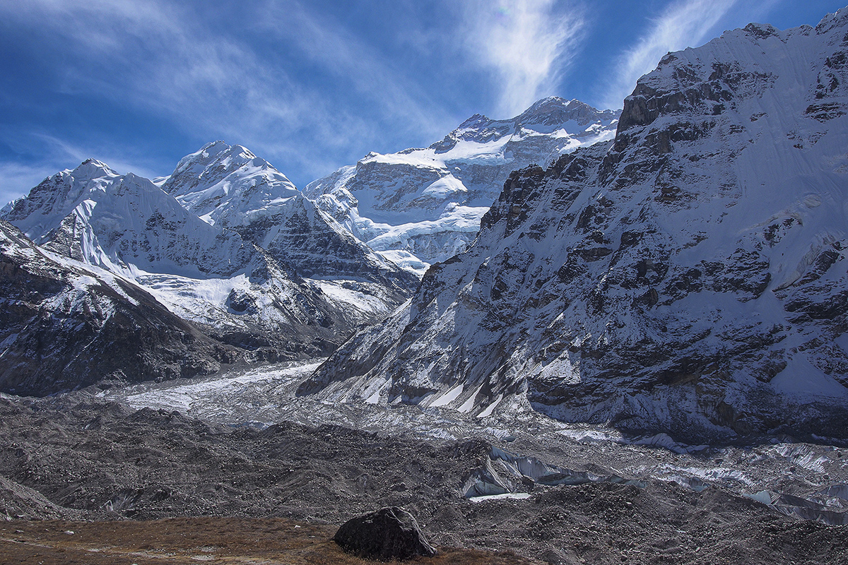 Rising high above me into a clear blue sky the world’s fifth highest mountain, and one of the truly great peaks of the Himalaya, stood in proud isolation; its steep flanks of pink granite sweeping up from beautiful valleys and complex glacier systems. Comforted by the warmth of the bright morning sun, I sat to relax beside a glacial lake at the foot of Makalu’s great south face. There I reflected upon the long and challenging journey upon which I had embarked and which had brought me to this incredible place. “