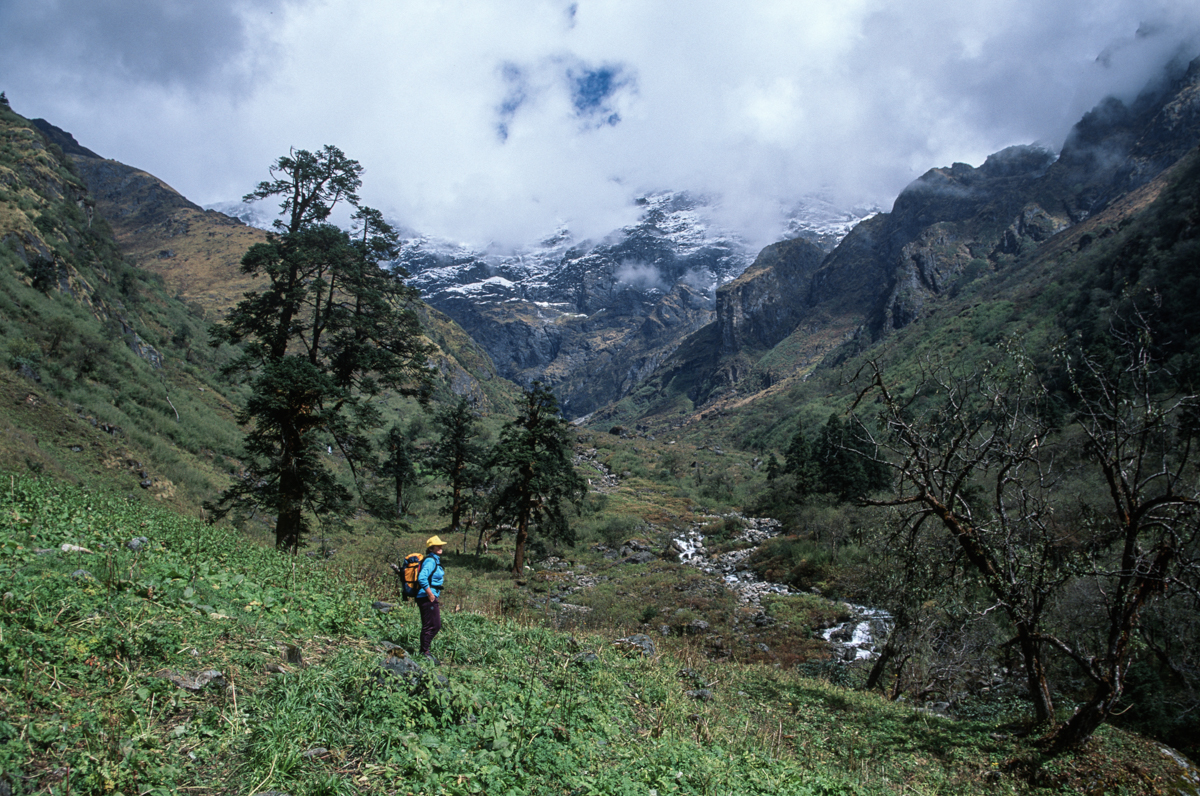 I had some doubts about the tiny trail that climbed steeply up onto a great ridge, at first across open scrub, but then through rhododendron, maple and fir forest. It certainly was not the route I had planned, nor was it shown on my rather crude map. But my Sherpa sardar Tenzing said he had been to the area before and he assured me that he felt it was the best approach to the pass. His experience proved to be invaluable, for the Rupina La remained stubbornly hidden from view beneath a persistent build-up of what turned out to be heavy snow-bearing cloud.