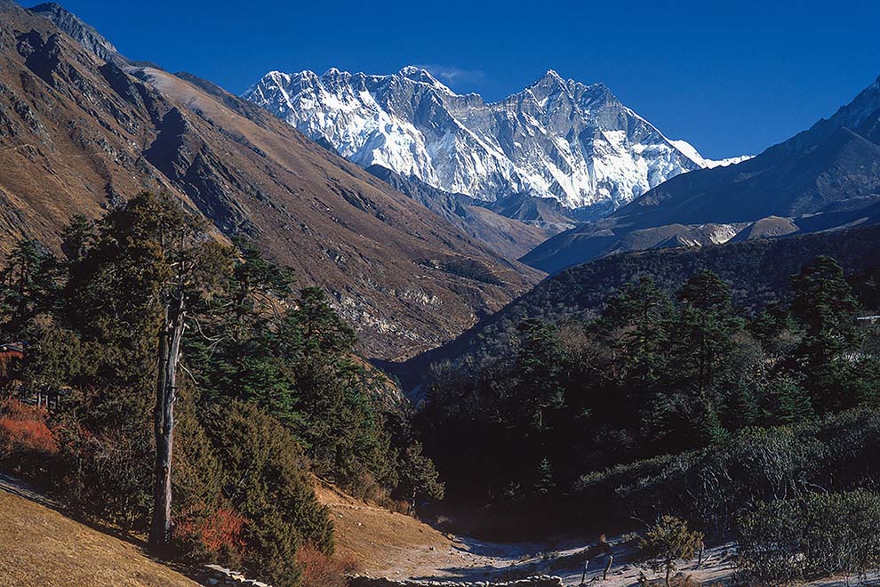 Apart from those of the great north face of Everest from base camp or the monastery at Rongbuk in Tibet, the best photographs of Everest are to be captured from more elevated and distant viewpoints. The famous 5500 metre Pang La Pass on the highway from Lhasa in Tibet also offers a classic view of the entire Everest massif and is of historical relevance. From Nepal, excellent views are achieved from the famous monastery at Thyangboche or, better still, from either of the minor 5000 plus metre peaks of Kala Pattar in the Khumbu Valley or Gokyo Peak above the Ngojumba Glacier.