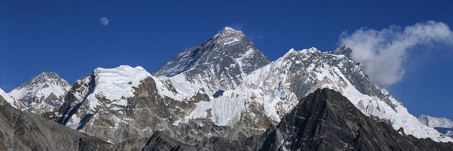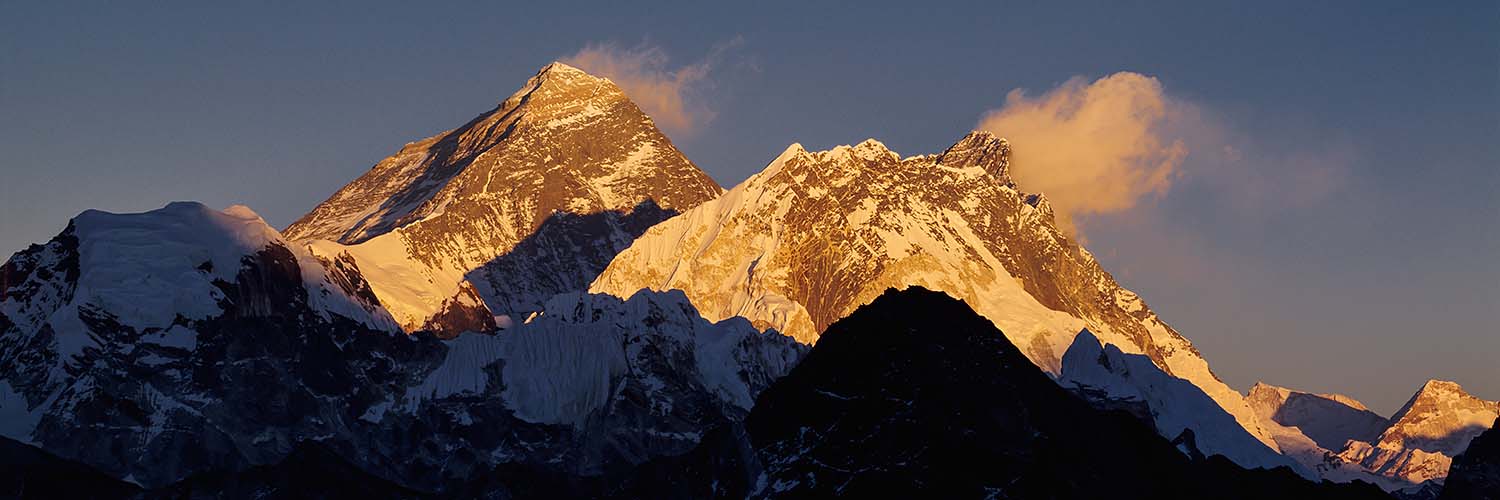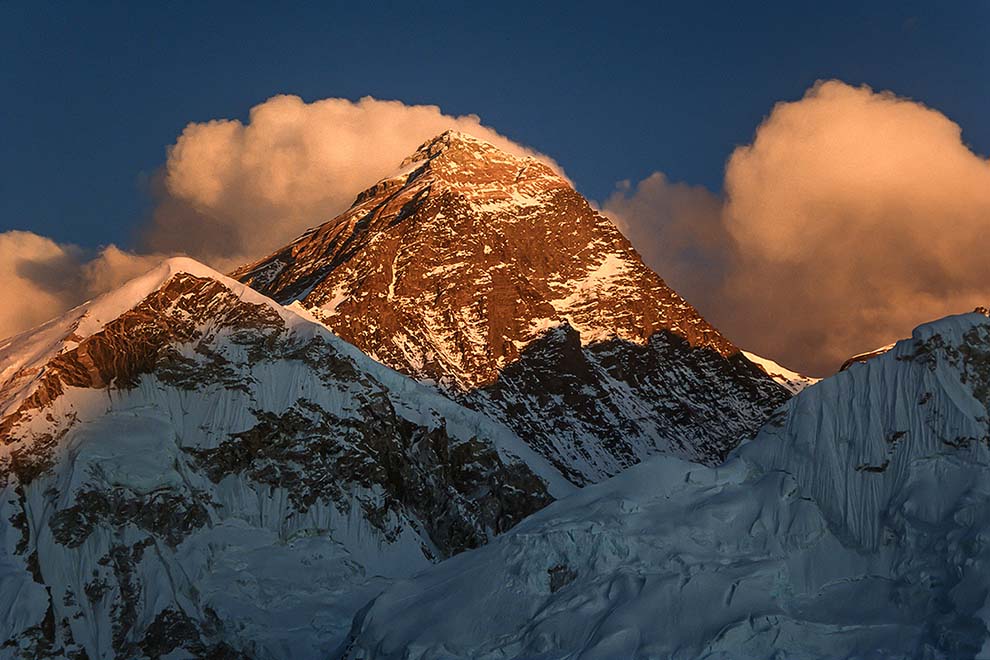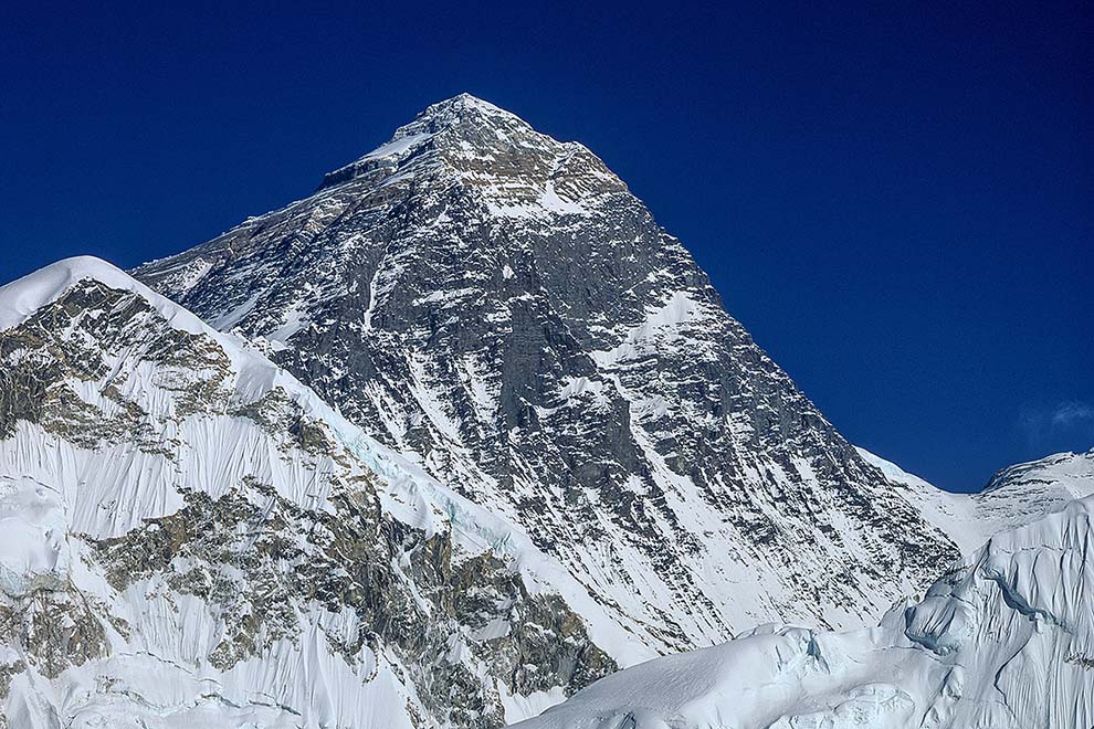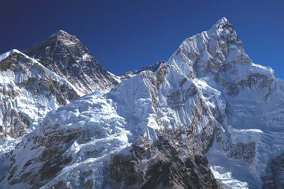 Standing at 8848m (28,029 ft) above sea level in the Mahalangur Himalaya on the border between Nepal to the south and Tibet to the north, Everest is the highest mountain in the world. It is known to the Nepalese as Sagarmatha and to the Tibetans as Chomolungma, ‘Goddess Mother of the World’. The mountain stands not in isolation but as the reigning peak of a group of peaks which includes Lhotse 8516m (27,940 ft) the fourth highest mountain in the world, and Nuptse 7861m (25,791 ft). In close attendance also are The West Shoulder 7205m (23,640 ft), and standing entirely within Tibet is Changtse, the north peak, 7543m (24,747 ft).