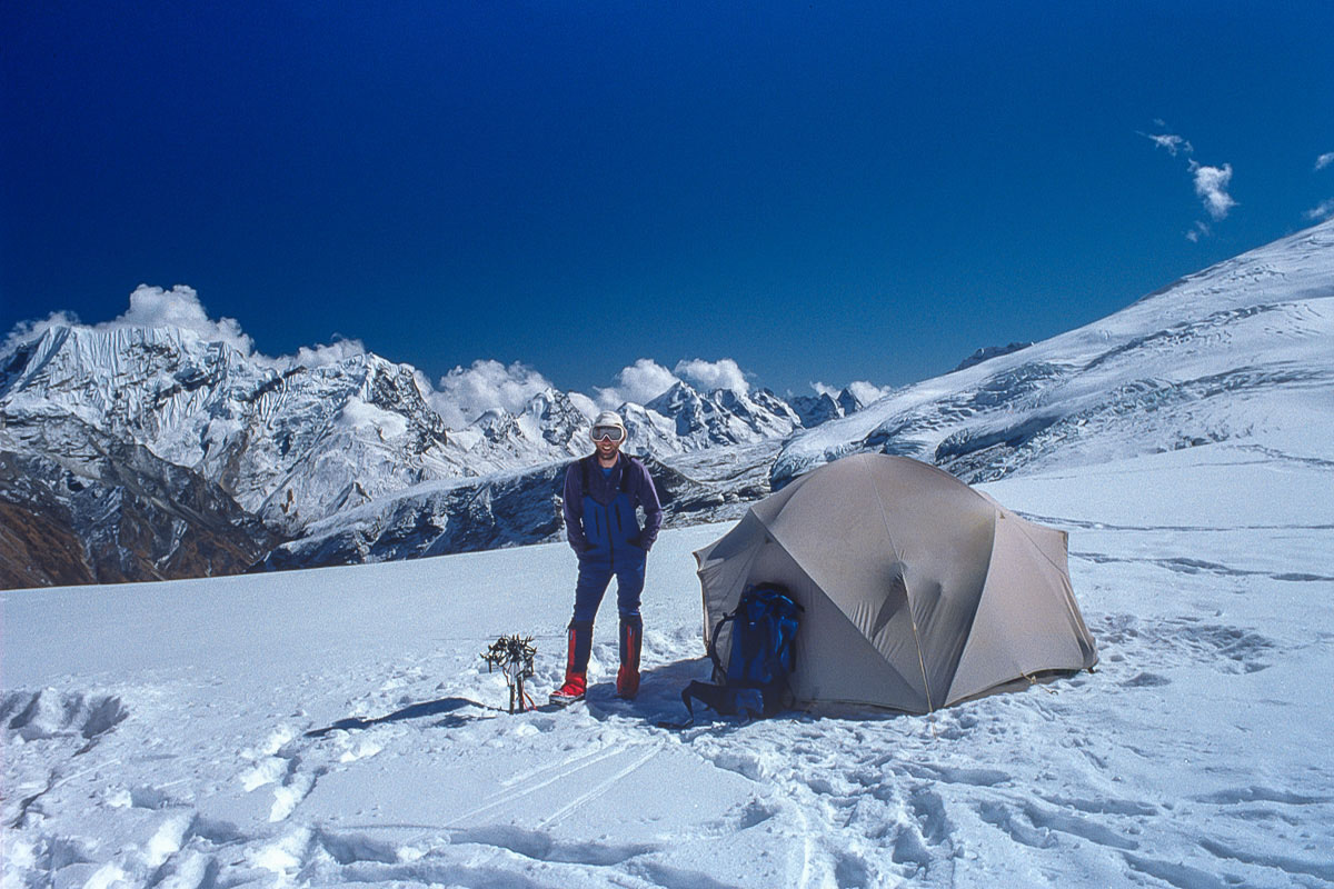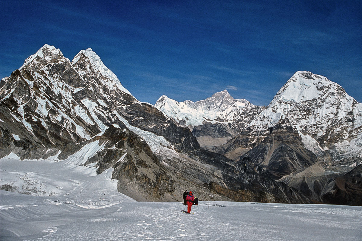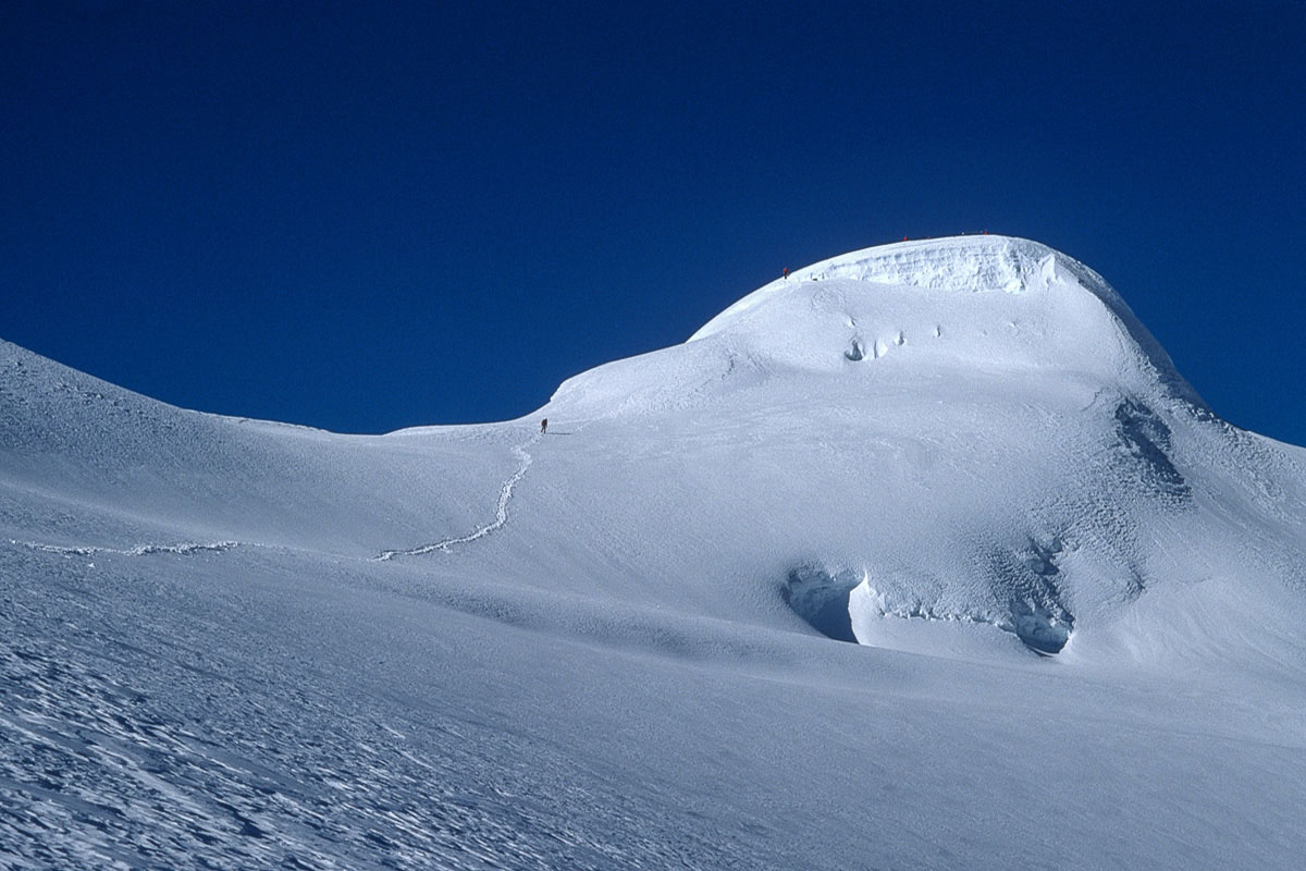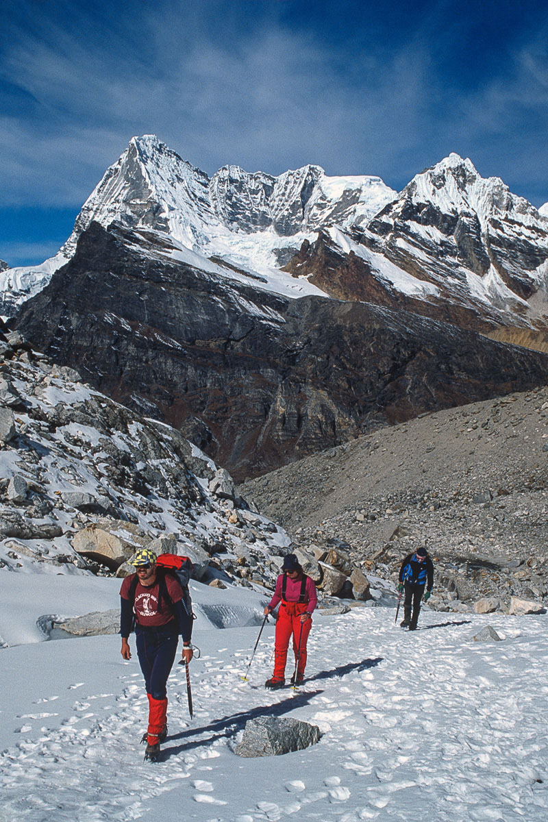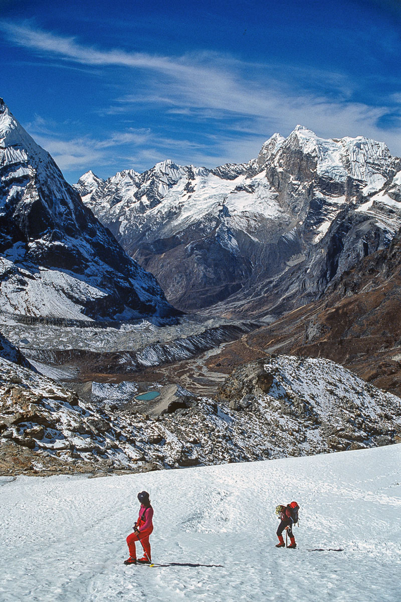 The first ascent of Mera Central was on May 20, 1953 by Colonel Jimmy Roberts and Sen Tenzing Sherpa and the standard route from the north involves high-altitude glacier walking from a base at Khare. The way climbs onto the Mera La, then on and up over a crevassed glacier with superb views of Thamserku, Kangtaiga, Cho Oyu and the Gokyo Valley beyond. An attack camp is usually established on a rocky platform that separates the Mera and Nau Lekh glaciers and the ascent competed on a second day. The final section continues over ever the steepening glacier and a minor bergschrund to a broad summit platform. The panoramic vista from the summit is regarded as one of the finest in the Himalaya and contains no less than five 8,000 metre peaks, the highest mountains in the world, Everest, Lhotse, Makalu, Cho Oyu and Kangchenjunga.