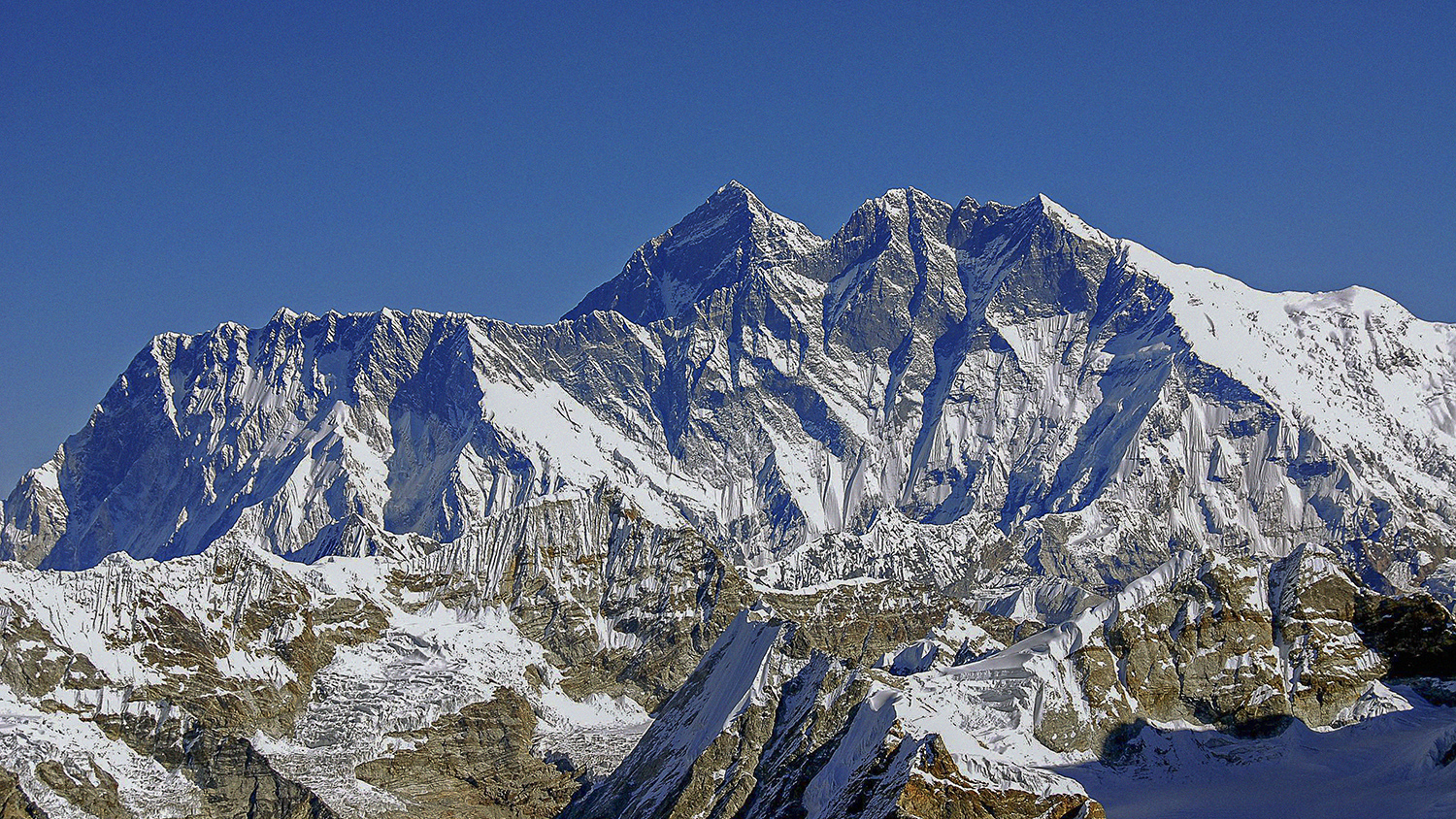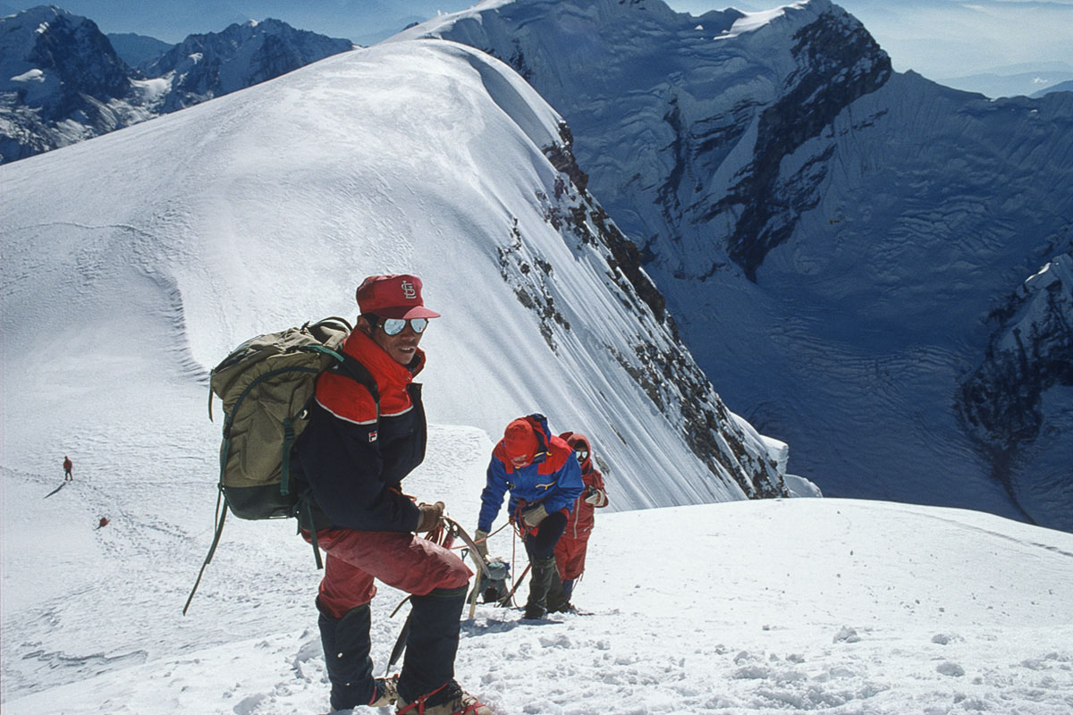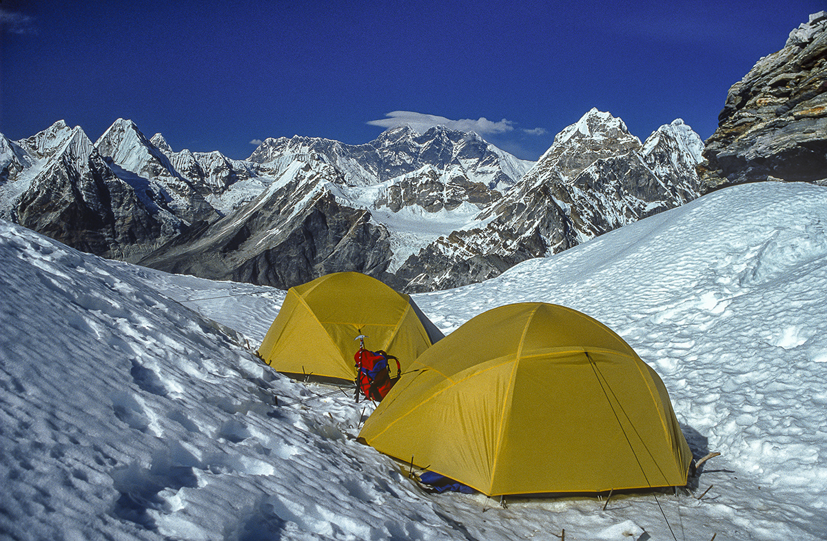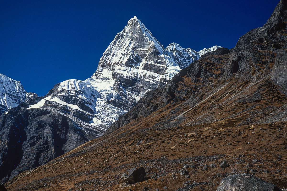 The first ascent of Mera Central was on May 20, 1953 by Colonel Jimmy Roberts and Sen Tenzing Sherpa and the standard route from the north involves high-altitude glacier walking from a base at Khare. The way climbs onto the Mera La, then on and up over a crevassed glacier with superb views of Thamserku, Kangtaiga, Cho Oyu and the Gokyo Valley beyond. An attack camp is usually established on a rocky platform that separates the Mera and Nau Lekh glaciers and the ascent competed on a second day. The final section continues over ever the steepening glacier and a minor bergschrund to a broad summit platform. The panoramic vista from the summit is regarded as one of the finest in the Himalaya and contains no less than five 8,000 metre peaks, the highest mountains in the world, Everest, Lhotse, Makalu, Cho Oyu and Kangchenjunga.
