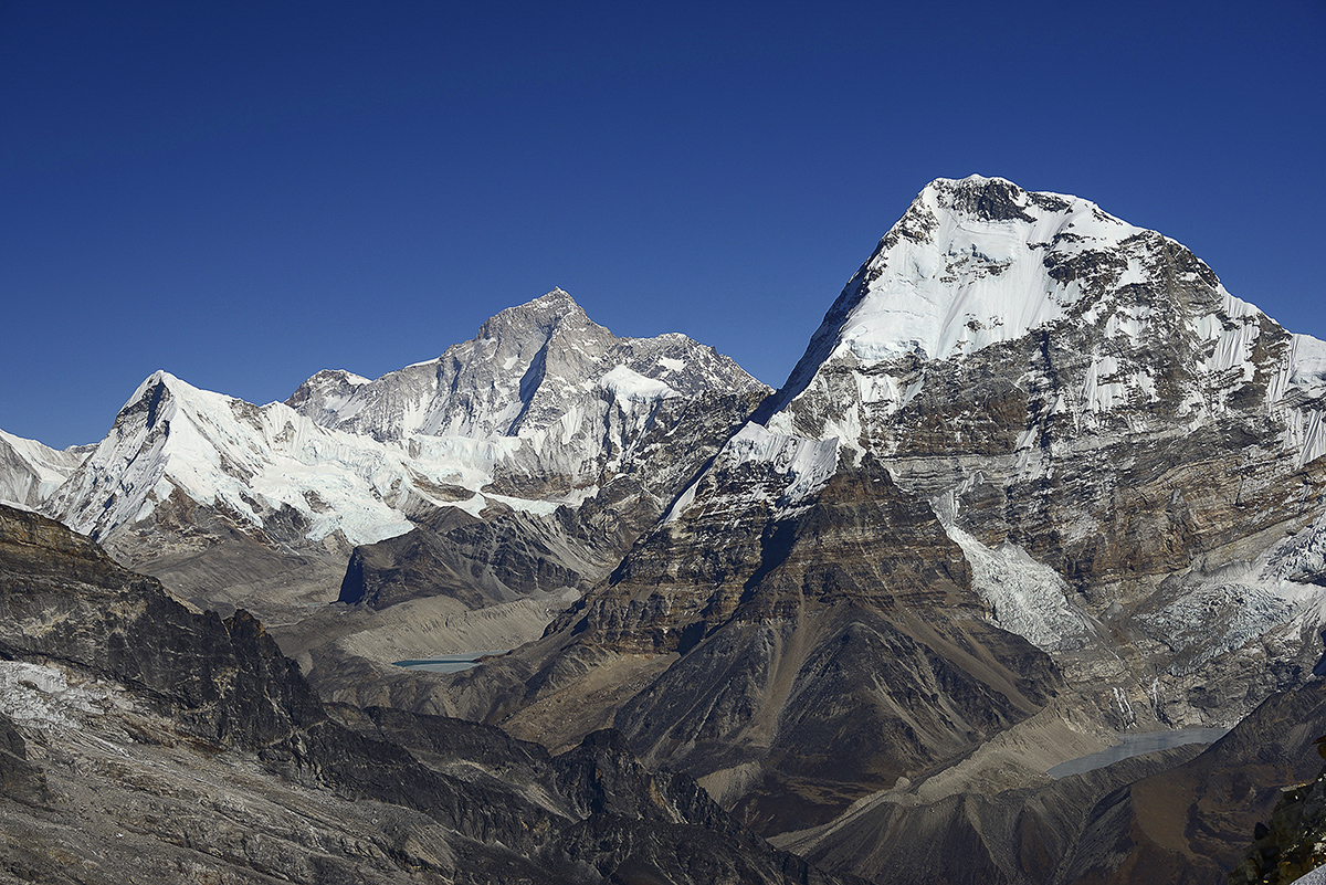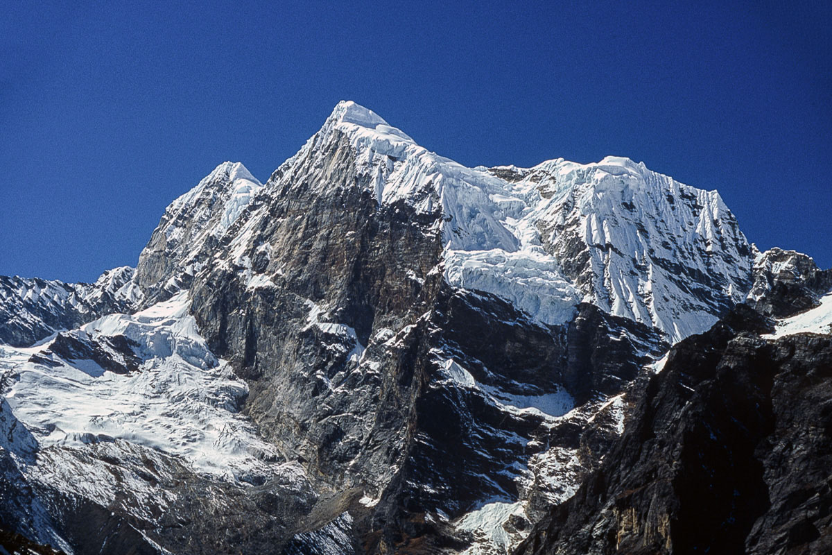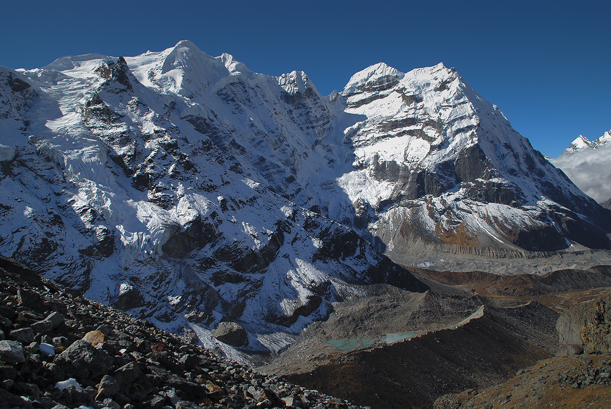 The Hinku Valley is overloooked by several interesting and attractive summits all rising in excess of 6,000 metres. The twin summits of Kossum Kangurru, 6,373 metres (20,910 ft) rise high above the tea houses at Tagnag, but are nowhere near as impressive as they are when seen from the Dudh Kosi, which is in stark contrast to Tagnagtse (aka Peak 43), 6,770 metres (22,212 ft) that dominates the valley from all directions. However, of all the many fine peaks hereabouts, the one generating the most interest is Mera. Classified as a trekking peak, it comprises three distinct summits, Mera North, 6,476 metres (21,247 ft); Mera Central, 6,461 metres (21,198 ft); and Mera South, 6,065 metres (19,898 ft).