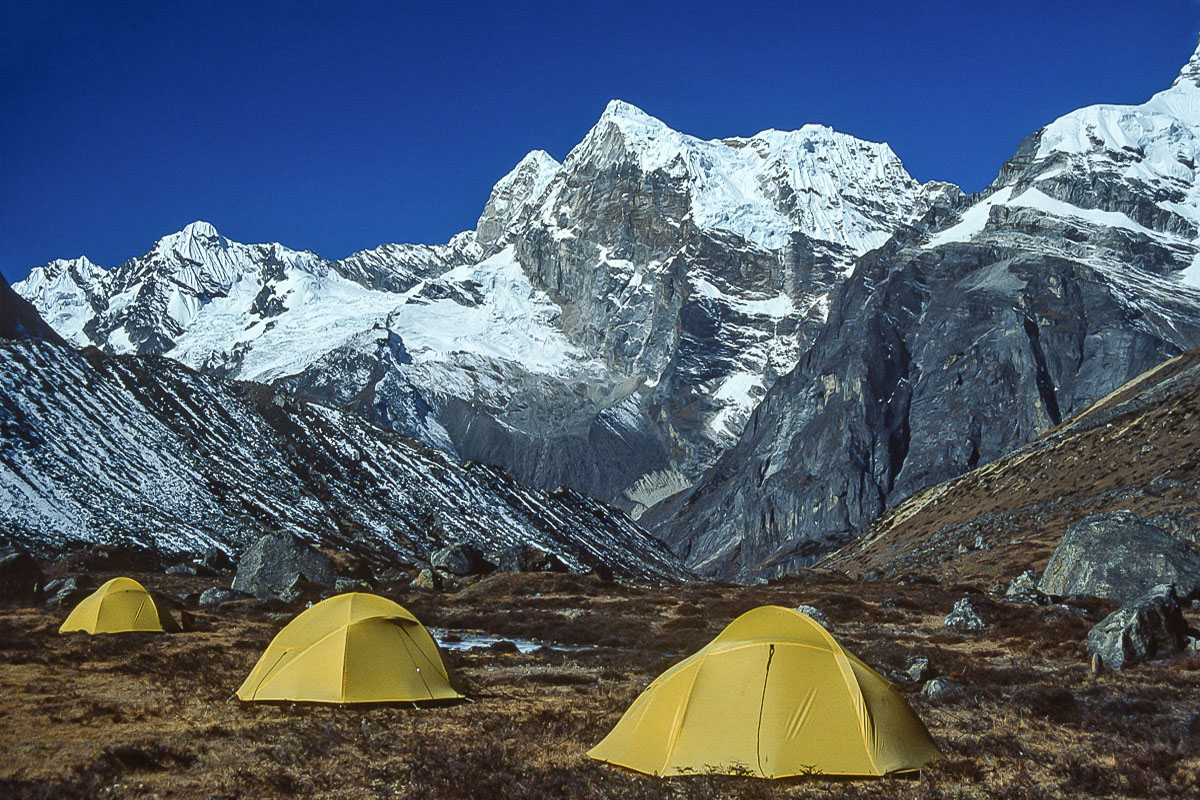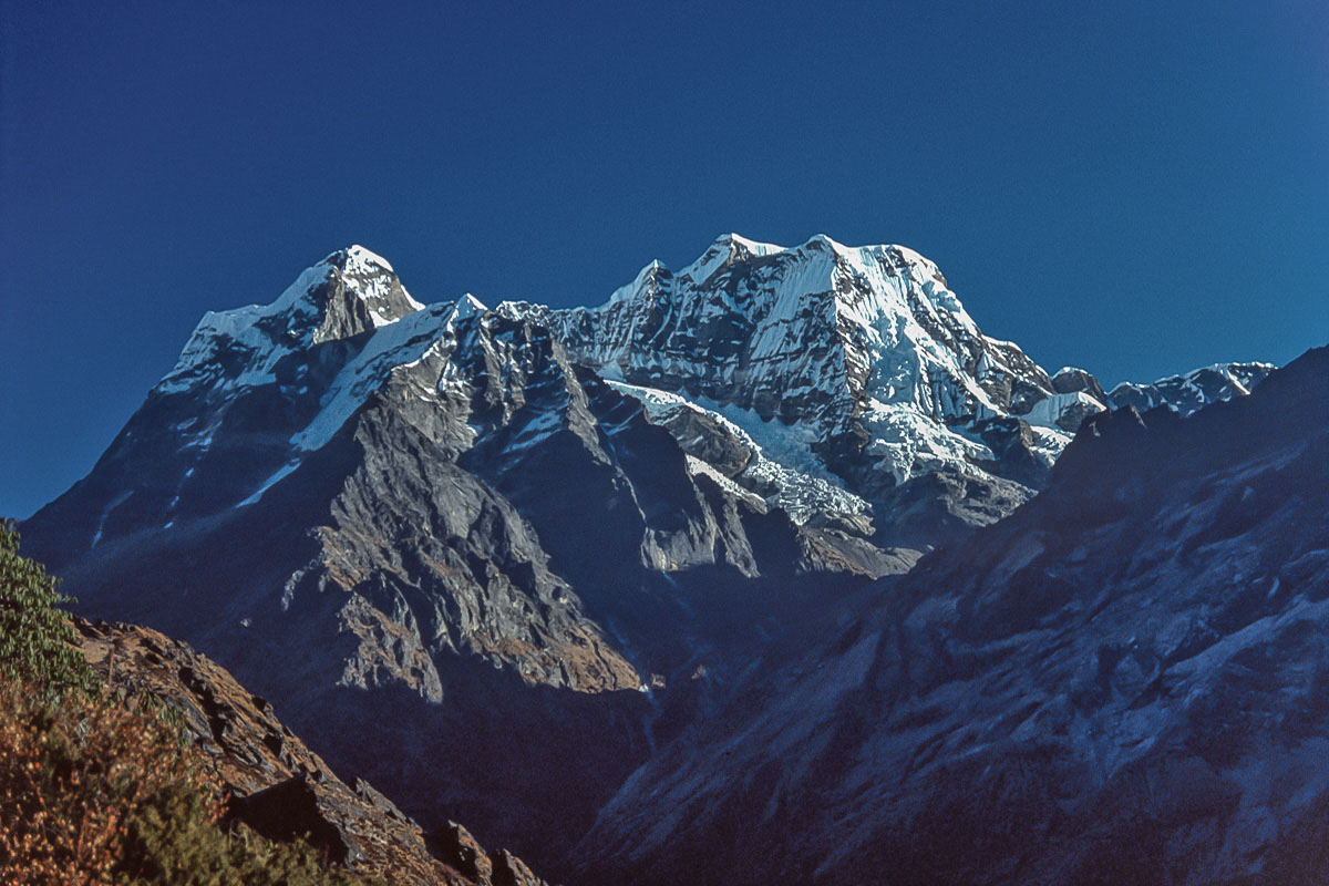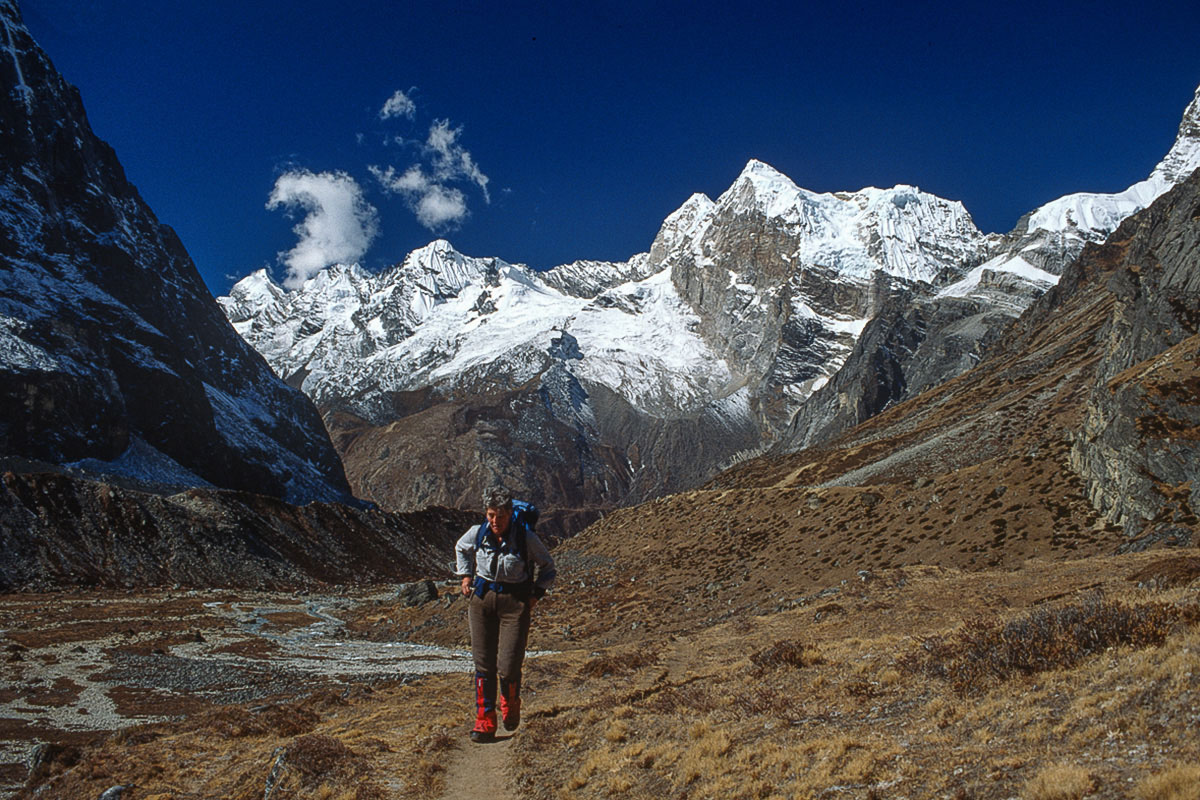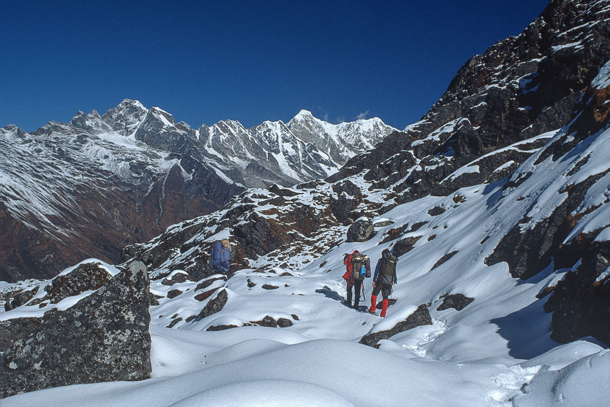Access from the west is best achieved via the 3,173 metre high Pangkongma La, a better and probably safer route than the considerably higher and steeper 4,900 metre Zatrawa La. In 1988 I pioneered a way from the east using an old and traditional trading route originating in the Arun Valley that crosses the Hongu Valley and the Salpa and then Surkie La Passes. This trail eventually carries on west to Lukla, The Khumbu and eventually Jiri and the Khumbu via the Pangkogma La, but to reach the upper sections of the Hinku Valley the way turns north to the Panch Pokhri lakes before descending steeply to the Hinku valley floor at Mosum Kharka.
