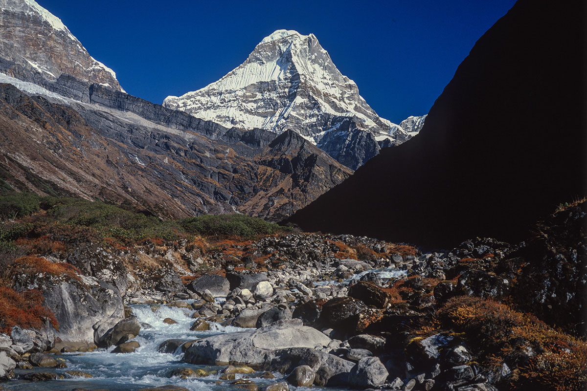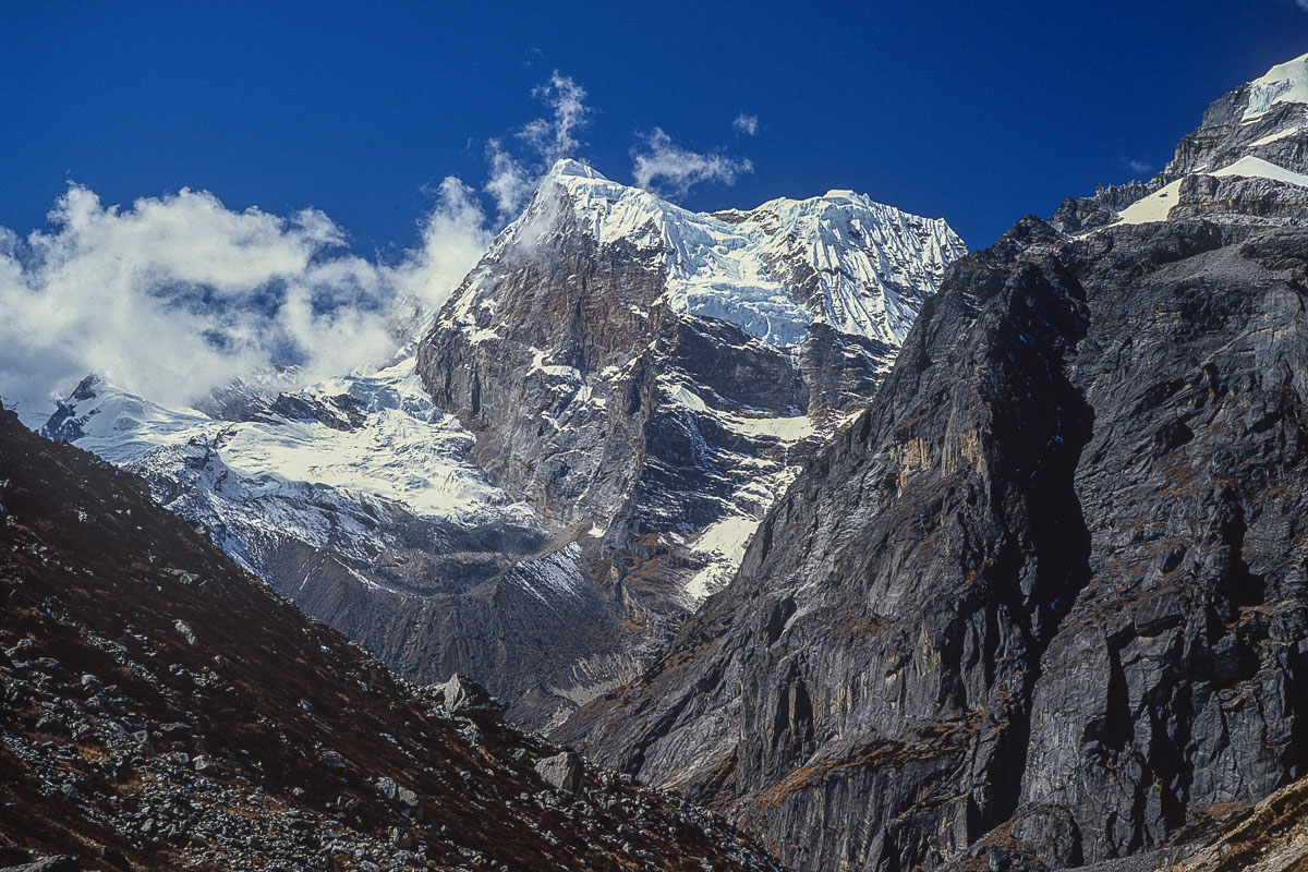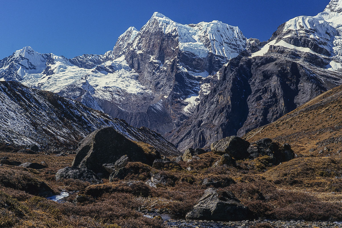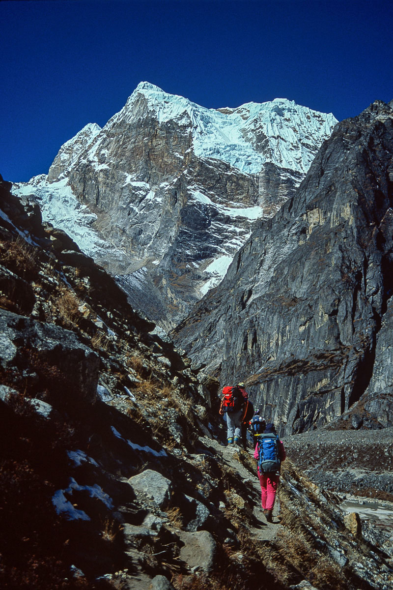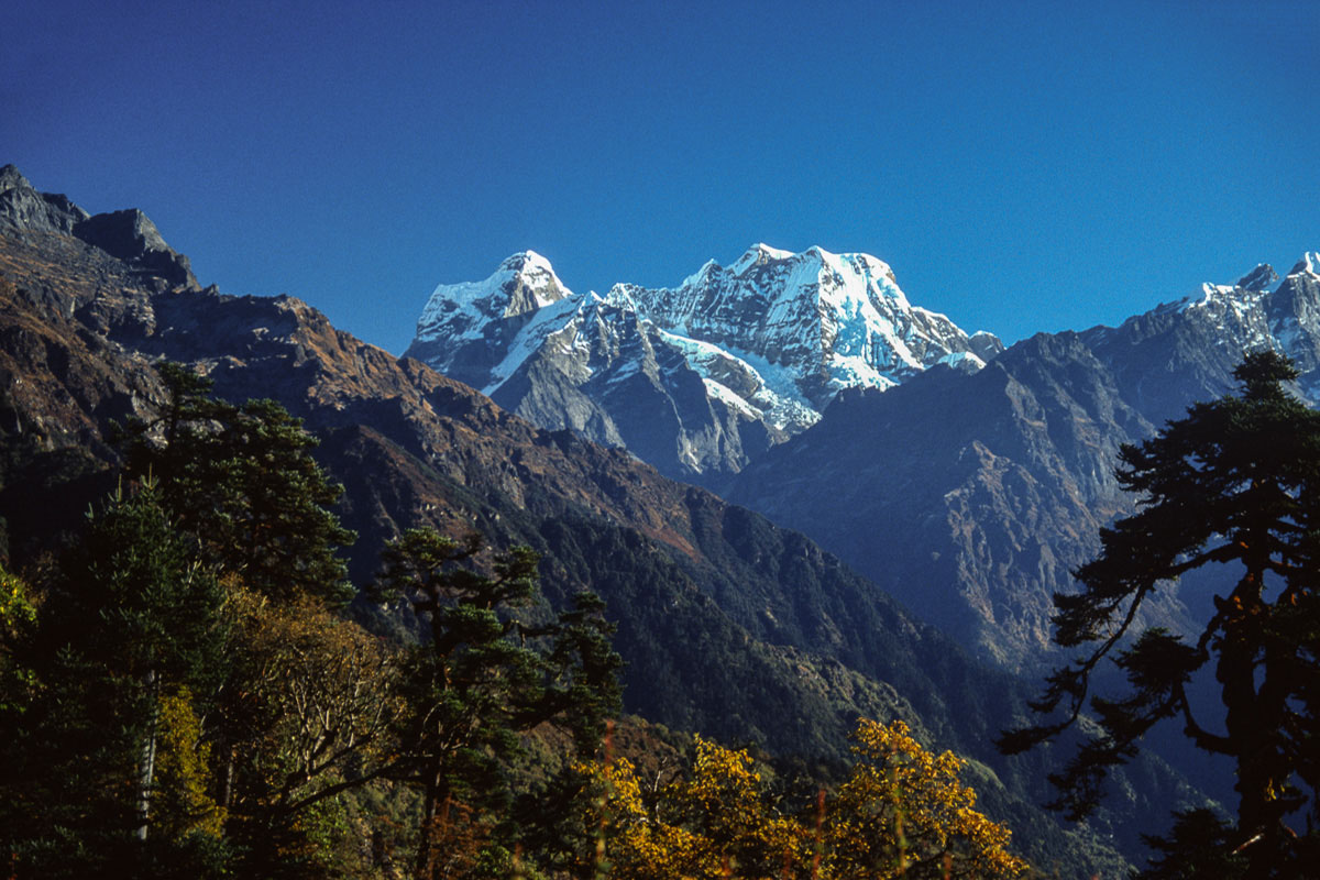 Access from the west is best achieved via the 3,173 metre high Pangkongma La, a better and probably safer route than the considerably higher and steeper 4,900 metre Zatrawa La. In 1988 I pioneered a way from the east using an old and traditional trading route originating in the Arun Valley that crosses the Hongu Valley and the Salpa and then Surkie La Passes. This trail eventually carries on west to Lukla, The Khumbu and eventually Jiri and the Khumbu via the Pangkogma La, but to reach the upper sections of the Hinku Valley the way turns north to the Panch Pokhri lakes before descending steeply to the Hinku valley floor at Mosum Kharka.