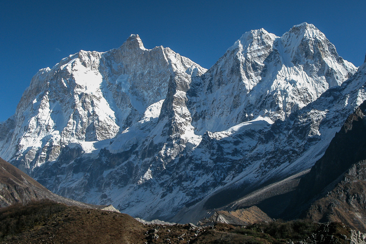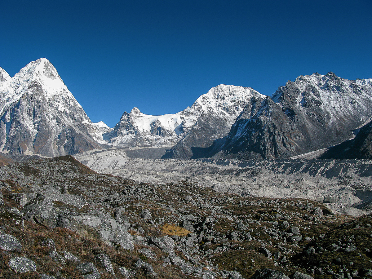With the exception of one section across a large landslip, the path upwards to Kambachen and Lhonak rose steadily and easily. The weather remained unsettled but there were many opportunities to see and photograph the peaks. The views of the Jannu Glacier, the Sharphu peaks and Kambachen Peak were impressive, as was our first view up the Kangchenjunga Glacier on the final approach to Lhonak, 4,780 metres. The thinly grassed wastes at Lhonak were popular with Tibetan herders and throughout our time there the sound of yak bells continually punctuated the still and bitterly cold air.