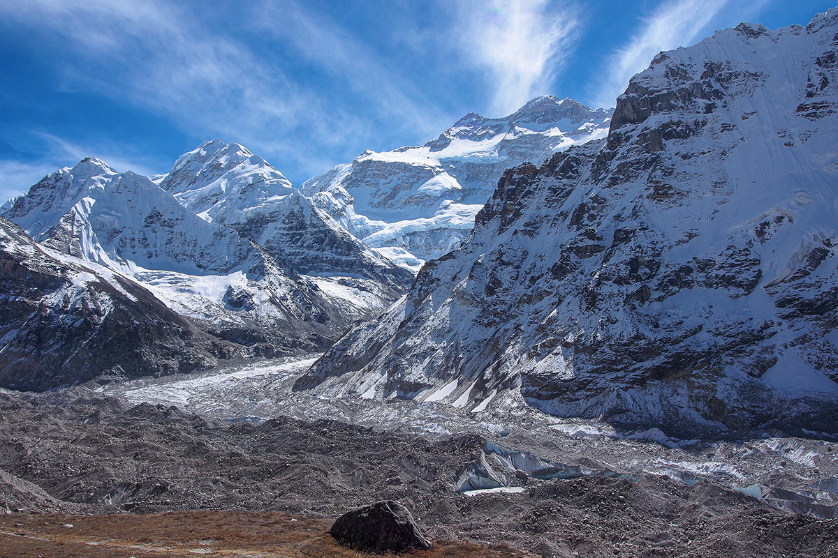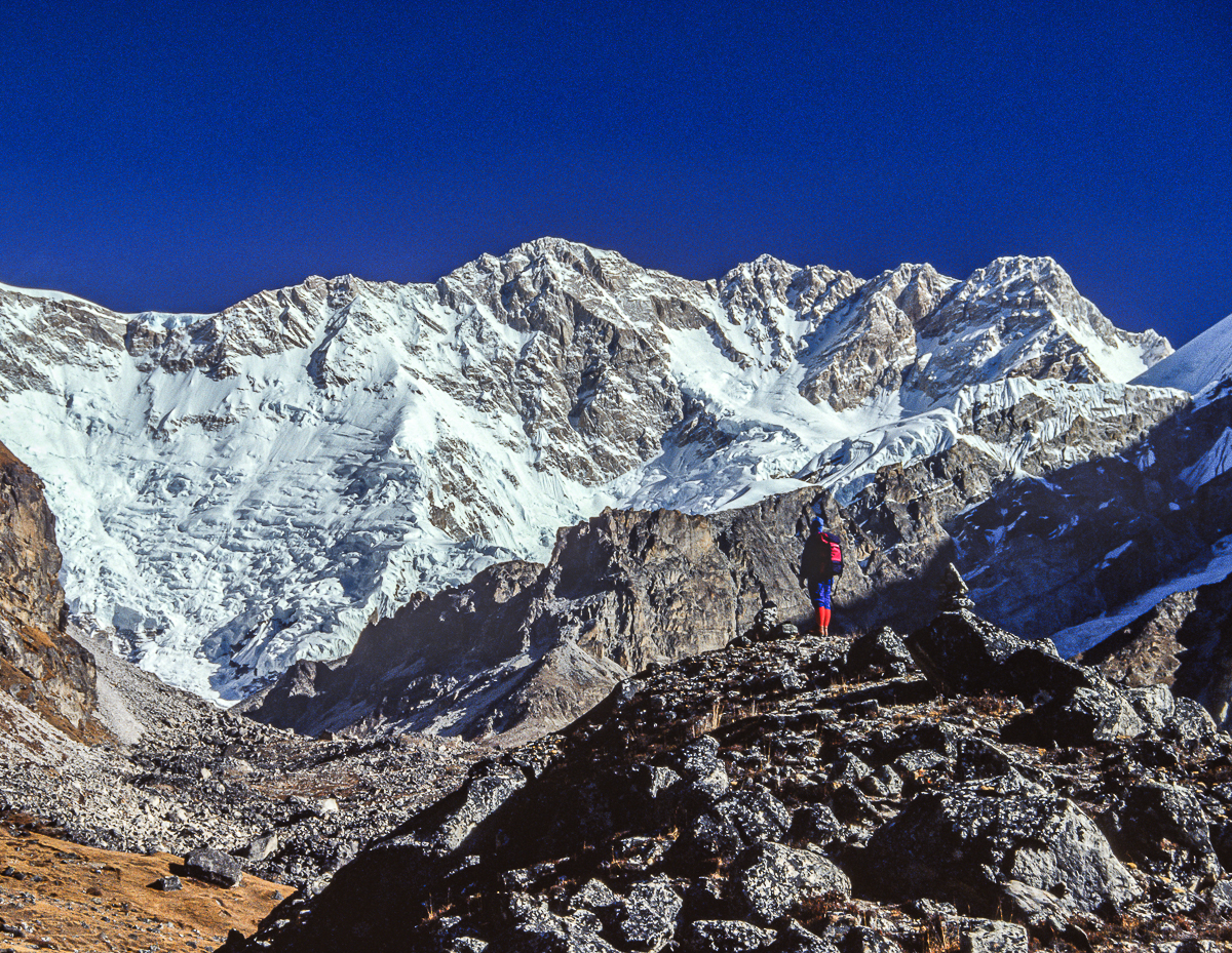 Our final objective was to reach Pangpema, base camp for expeditions climbing Kangchenjunga from this side. The easy trail between Lhonak and Pangpema rose steadily along the grass covered lateral moraine, rising high above the rubble covered glacier several hundred feet below. Kangchenjunga’s summit only revealed itself on the very last stage of the walk to Pangpema, much of the time it was hidden behind Wedge Peak, 6,750m., (22,147 ft.), a bold mountain whose summit ridge was comprised of intricately carved ice flutings.