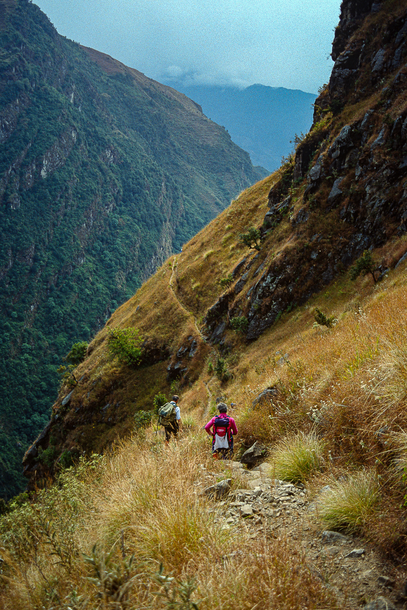 Our route now descended into and then followed the valley of the Kabeli Khola. Yamphudin was the last permanent settlement on this approach and from here the tenuous trail crossed the remote Omje Khola valley; its dense and unspoilt forests of bamboo, rhododendron or pine provided welcome shade during the heat of the day, but attracted billowing clouds in the afternoons.