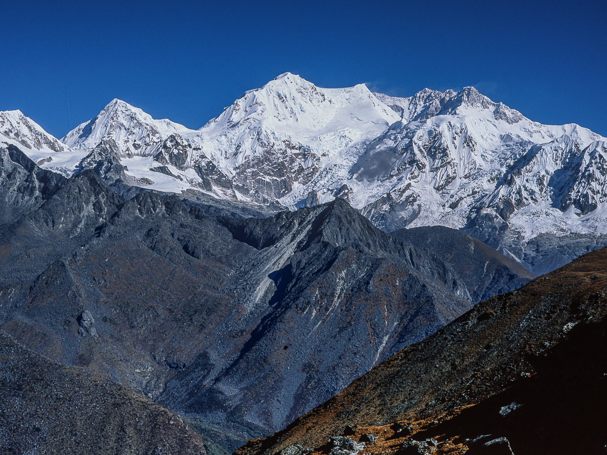 The mountain’s eastern aspect was, however, a familiar sight to visitors to Darjeeling and until 1849 Kangchenjunga was thought to be the highest mountain in the world. Early attempts to climb Kangchenjunga were made from Sikkim to the east, but the more recent activity has been on the Nepalese side. British climbers have played a significant role in the climbing history of the mountain; Joe Brown and George Band made the first ascent from the south via the Yalung Glacier in 1955 and then Doug Scott, Peter Boardman and Joe Tasker made the first oxygen free ascent from the Kangchenjunga Glacier to the north-west in 1979.